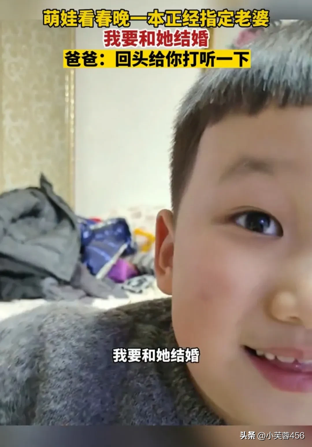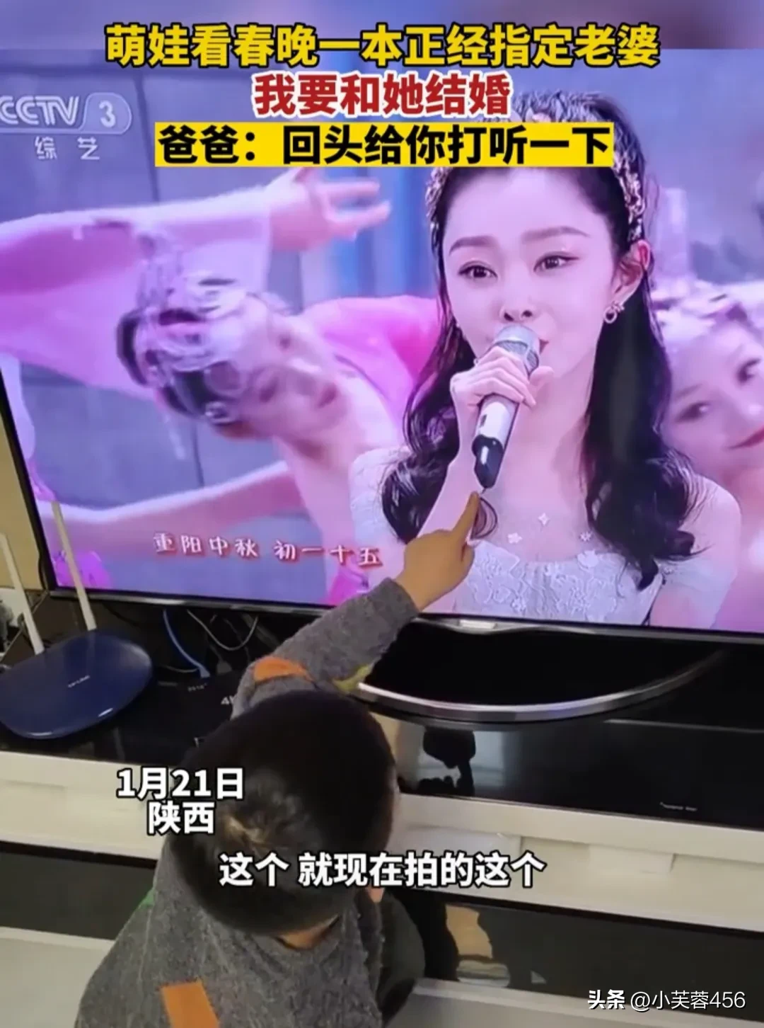 这天,萌娃在观看春晚,到一个节目时,他突然很激动很开心地,指着电视上一位美女,告诉爸爸,我要和她结婚。
